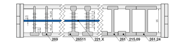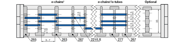 Os suportes de deslize são montados de 20 em 20 elos a partir da extremidade fixa da calha articulada. Elo montado.