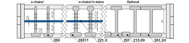 O sistema autoglide foi agora adaptado e otimizado para a gama E2/000 da igus®. O aumento da superfície deslizante através de uma maior largura das travessas autoglide garante uma maior duração de vida do sistema. Uma aba deslizante de encaixe garante o alinhamento seguro da calha articulada nos primeiros metros do curso. Os suportes guia excêntricos estão fixos ao chão a cada 2 metros.