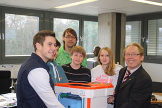 Os nossos jovens engenheiros apoiam a doação de uma impressora 3D para Otto-Hahn-Gymnasium em Bensberg. A escola precisava da impressora para participar numa competição de tecnologia.