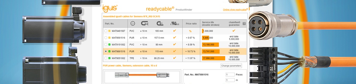 A pesquisa de produtos readycable® com cálculo imediato da duração da duração de vida dos cabos de acionamento selecionados: