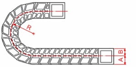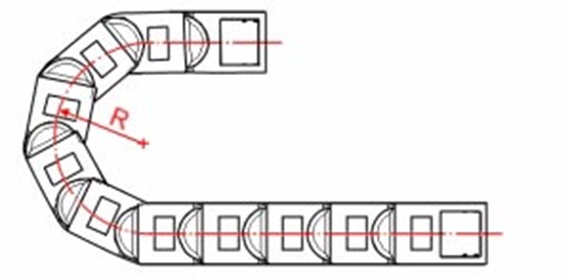 A seleção do raio de curvatura adequado está dependente dos cabos e/ou mangueiras utilizados na calha articulada. Mais informações disponíveis na secção "Especificações de projeto".