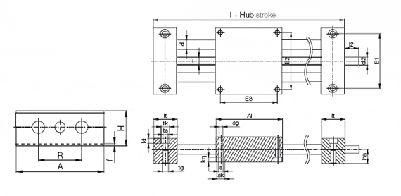 | Número de encomenda | Comprimento do curso | Veio de metal Peso adicional | Capacidade de carga estát. máx. | A | Al | H | E1 | E2 | E3 | ||||