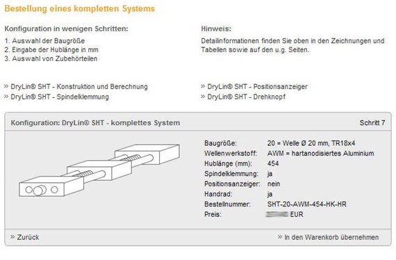 Com o objectivo de projectar os produtos drylin® para aplicações individuais, o configurador está disponível nas páginas de produto mais relevantes. As guias lineares drylin® T, drylin® N e mesas SHT podem ser configuradas. Comprimento, ajuste de folga e os acessórios opcionais podem ser definidos em função dos requerimentos.