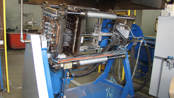 This moulding machine is used to make hollow cast parts with the aid of the waxmelting process. A sand-resin mixture is sprayed into the bottom dies and hardens there. Previously, this led to significant soiling of the guide shafts which became clogged with the sticky mixture and had to be replaced. In addition, the bronze bearings had to be lubricated permanently, since the high temperatures made the lubricant dry out. Thanks to drylin® guide rails and lubricant-free iglidur® plain bearings these problems are now a thing of the past.