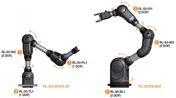 | 6. Articulação básica RL-90-BL1 | 4 | 8 | 180° (±90°) | 190° (±95°) | 180° (±90°) | - | 1250 | 20 | 10 |