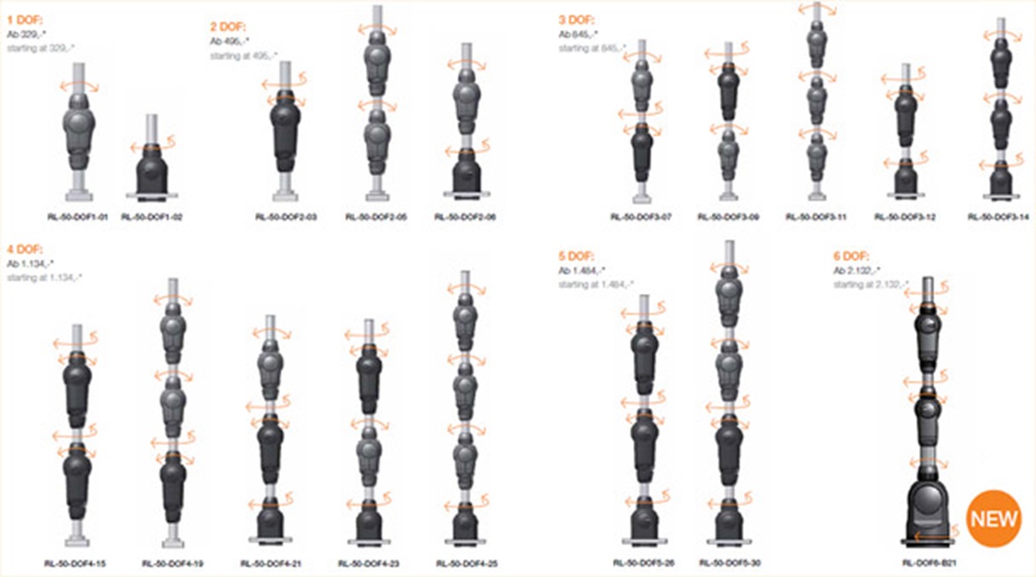 | 5. Articulação de 2 eixos RL-50-003 | 4 | 4 | 180 ° (+180°/0°) | 235° (+180°/-55°) | 340° (±170°) | 540° (±270°) | 400 | 12 | 5 |
